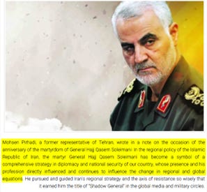 A review of Resalat’s opinion section shows numerous columns written by Pirhadi himself, where he explicitly praises Qassem Soleimani, depicting him as “more than a military commander” and as a central architect of Iran’s regional “Axis of Resistance” strategy. These writings adhere closely to IRGC and Quds Force narratives, positioning Soleimani as a visionary and moral figure whose strategic direction shaped Iran’s regional posture.