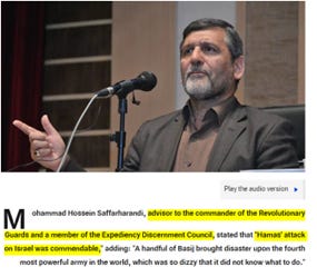 In 2023, in a speech reported by Iran International and echoed in other Iranian outlets, Saffar-Harandi explicitly described Hamas’s 7 October attack on Israel as “قابل تحسین” - “worthy of praise”, and added that “a handful of Basij fighters brought the world’s fourth-strongest army to the point that it was dizzy and didn’t know what to do.”