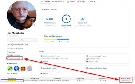 I started digging into historical WHOIS records of the domain. There were a few, but the last one, and ironically, the oldest record, revealed the first email address used to open this domain. An email address with the domain “larsersej.dk”, with direct association to the domain “deepfucks[.]com”.