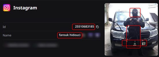 Both emails related directly to Hidoussi’s, but the email hidoussifarouk6@gmail[.]com (belongs to Farouk Hidoussi / Farouk Hidouci) found in direct association with an Instagram account of an armed individual with a face mask, standing near a vehicle that seems to be tagged with a car plate of France.