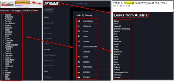 In the picture: True-leaks[.]com, SPYGAME and zxc[.]qa websites