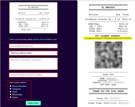 ElMercado represents the frontend, the actual service. It’s a consumer-facing layer of the system. An express-delivery model designed for the rapid fulfillment of different illicit drugs across major Spanish cities. The branding aligns with contemporary “quick-commerce” aesthetics - fast delivery, urban coverage, and on-demand availability, but applied to illicit products.
