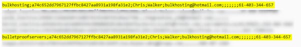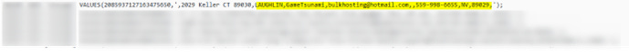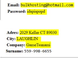 The username appeared in a data leak from 2019 as well, directly connected to another email: bulkhosting@hotmail[.]com, shown with details such as password, address, zip code, city and name of brand called “GameTsunami”.