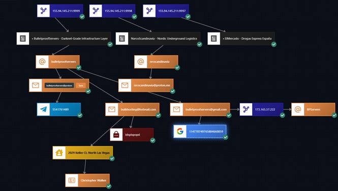 This section visualizes the underlying relationship structure connecting all identified entities across the network. By mapping IP addresses, domains, email accounts, social handles, and operational identifiers, the diagram demonstrates that services which appear unrelated on the surface, BulletproofServers, NarcoScandinavia, and ElMercado, are in fact interlinked through shared infrastructure, overlapping contact points, and recurring digital identifiers.