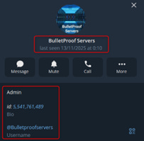 The username itself led to an email address (bulletproofservers@protonmail[.]com), and the Telegram user (bulletproofservers), claiming he is the ADMIN in his BIO.