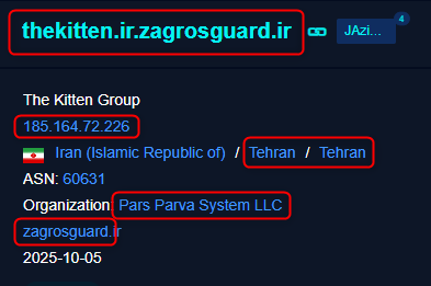 While searching other entities using the IP address, I found a domain named “thekitten.ir.zagrosguard.ir” with the same IP address, the same ASN.