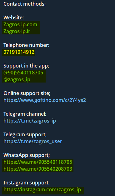 Despite marketing itself with features like “Sustainable security” and “Global END to END encryption”, Zagros’s privacy policy contains a critical provision that indicates potential state surveillance and control. While the service claims to protect user privacy, its terms confirm that the service provider has access to users’ personal details, including full name, phone number, and password. Crucially, this sensitive data “will be provided upon official request from competent authorities”. This policy guarantees that Iranian security or intelligence agencies have a clear, documented path to obtain the identity and activity data of any user, effectively centralizing control over the circumvention process and raising serious concerns about surveillance for political activists or others deemed a risk to the regime.