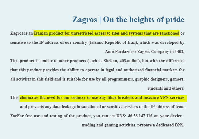 The “Zagros” service, operated by the Amn Pardaz Nasr Zagros Company, is an officially declared Iranian product designed to provide a domestically controlled solution for accessing the global internet. Its primary purpose is to enable users within the Islamic Republic of Iran to bypass international sanctions and government filtering/blocking of online systems and websites.
