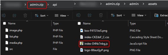 Since the admin page is also accessible, I was able to download the actual admin.zip file and review it for further understanding of the system and architecture of the website.