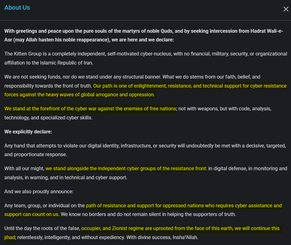 The obvious mention to thekitten[.]ir is a direct link to thekitten[.]group, a covert pro-Iranian infrastructure designed to support cyber warfare and espionage against Israeli and other targets. This platform functions as a sophisticated communication hub aimed at coordinating hostile cyber activities by different pro-Iranian groups.